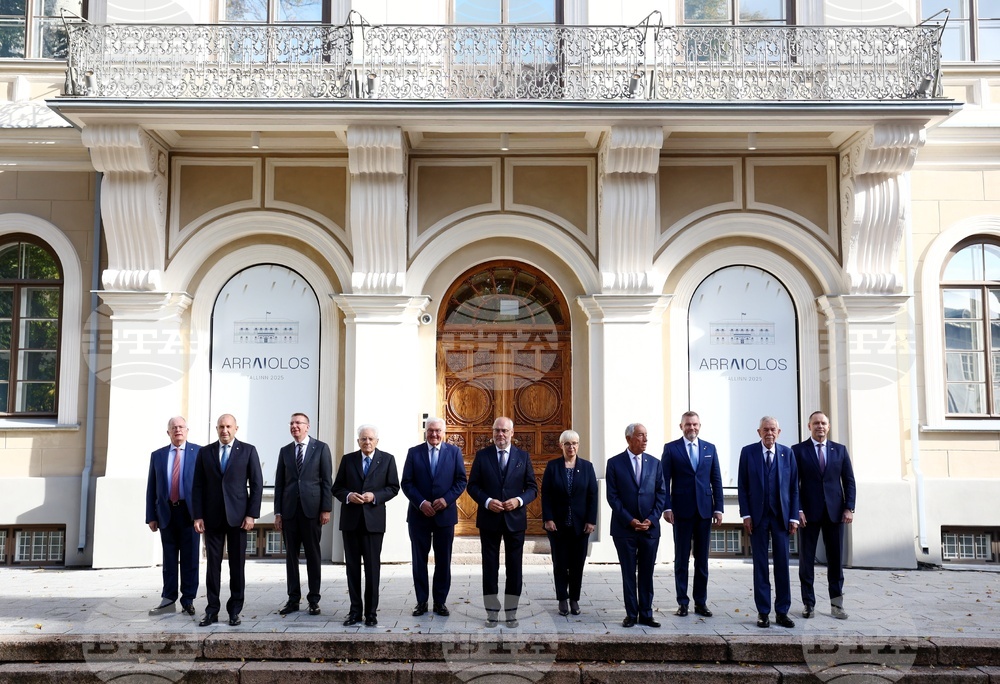 Талин (10 октомври 2025) Президентът на България Румен Радев участва в 20-ата неформална среща на държавните ръководители от групата „Арайолуш“, която се провежда в Талин, Естония. На снимката (от ляво надясно): президентът на Гърция Константинос Тасулас, президентът на България Румен Радев, президентът на Латвия Едгарс Ринкевичс, президентът на Италия Серджо Матарела, президентът на Германия Франк-Валтер Щайнмайер, президентът на Естония Алар Карис, президентът на Словения Наташа Пирц Мусар, президентът на Португалия Марсело Ребело де Соуза, президентът на Словакия Петер Пелегрини, президентът на Австрия Александър ван дер Белен, президентът на Полша Карол Навроцки.