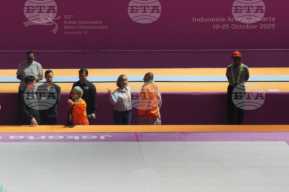 Officials of the Indonesian Gymnastics Federation inspect the venue prepared for the Artistic Gymnastics World Championships at Indonesia Arena in Jakarta, Indonesia, Friday, Oct. 10, 2025. (AP Photo/Dita Alangkara)