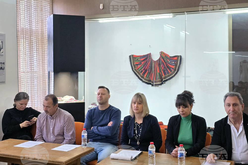 Плевен (10 октомври 2025) Уъркшоп на тема „Културен мост: Народно облекло и танци от Румъния“ се провежда в Регионалния исторически музей - Плевен. На снимката (от ляво надясно): членът на Националната комисия за опазване на нематериалното културно наследство в Румъния Елена Ягар, хореографите Флориан Теодореску и Кристиан Валеа, ръководителят на отдел „Етнография“ в РИМ - Плевен Миглена Николова, уредникът в отдела Десислава Генчева и хореографът Джейлян Демирав.