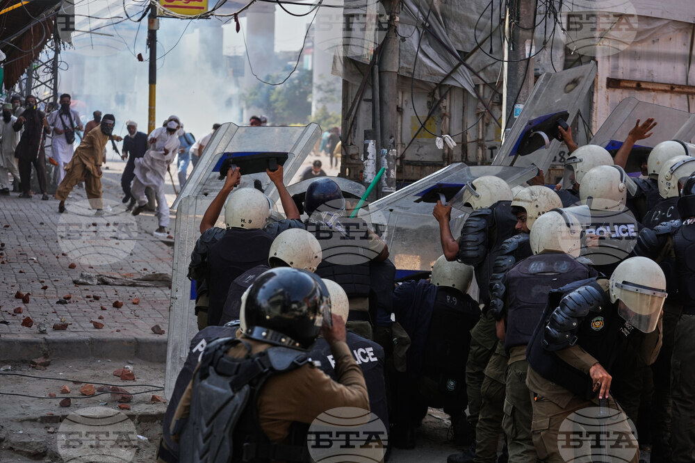 Police personnel run for cover after supporters of Islamist party 'Tehreek-e-Labbaik Pakistan' throw stones toward them during clashes ahead of their pro-Palestinian march toward capital Islamabad, in Lahore, Pakistan, Friday, Oct. 10, 2025. (AP Photo/K.M. Chaudary)