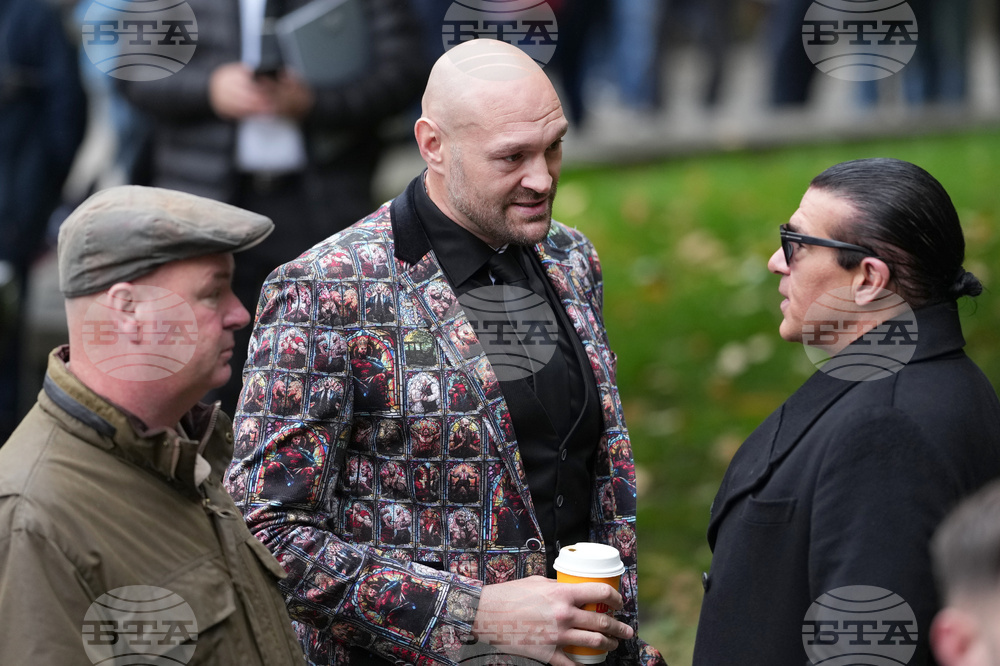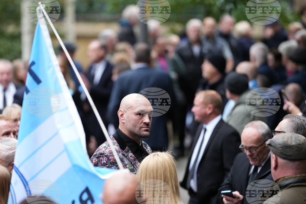 Boxer Tyson Fury, centre, attends the funeral of boxer Ricky Hatton, in Manchester, England, Friday, Oct. 10, 2025. (AP Photo/Jon Super)