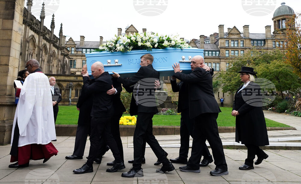 The coffin boxer Ricky Hatton is escorted in to Manchester Cathedral for his funeral service in Manchester, England, Friday, Oct. 10, 2025. (AP Photo/Jon Super)