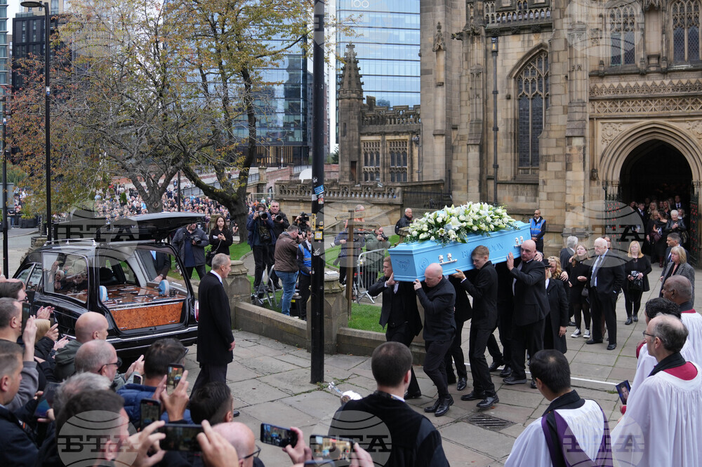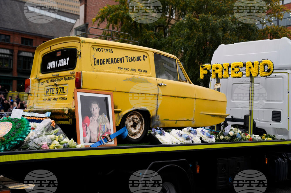 The funeral cortege for boxer Ricky Hatton arrives at Manchester cathedral for the service in Manchester, England, Friday, Oct. 10, 2025. (AP Photo/Jon Super)