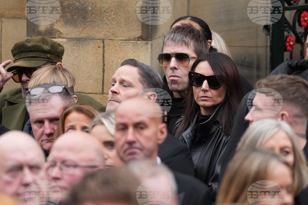Liam Gallagher, top centre, of the band Oasis attends the funeral for boxer Ricky Hatton in Manchester, England, Friday, Oct. 10, 2025. (AP Photo/Jon Super)