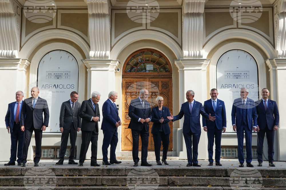 From left, President of Greece Constantine Tassoulas, President of Bulgaria Rumen Radev, President of Latvia Edgars Rinkevics, President of Italy Sergio Mattarella, President of Germany Frank-Walter Steinmeier, President of Estonia Alar Karis, President of Slovenia Natasa Pirc Musar, President of Portugal Marcelo Rebelo de Sousa, President of Slovakia Peter Pellegrini, President of Austria Alexander Van der Bellen, President of Poland Karol Nawrocki smile after a group photo during the 20-th informal meeting of the Arraiolos Group Heads of State in Tallinn, Estonia, Friday, Oct. 10, 2025. (AP Photo/Sergei Grits)