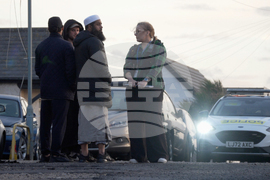 FILE - Locals view the damage outside the front entrance of the mosque in Peacehaven, following a suspected arson attack, in East Sussex, England, Sunday, Oct. 5, 2025. (Jamie Lashmar/PA via AP, File)