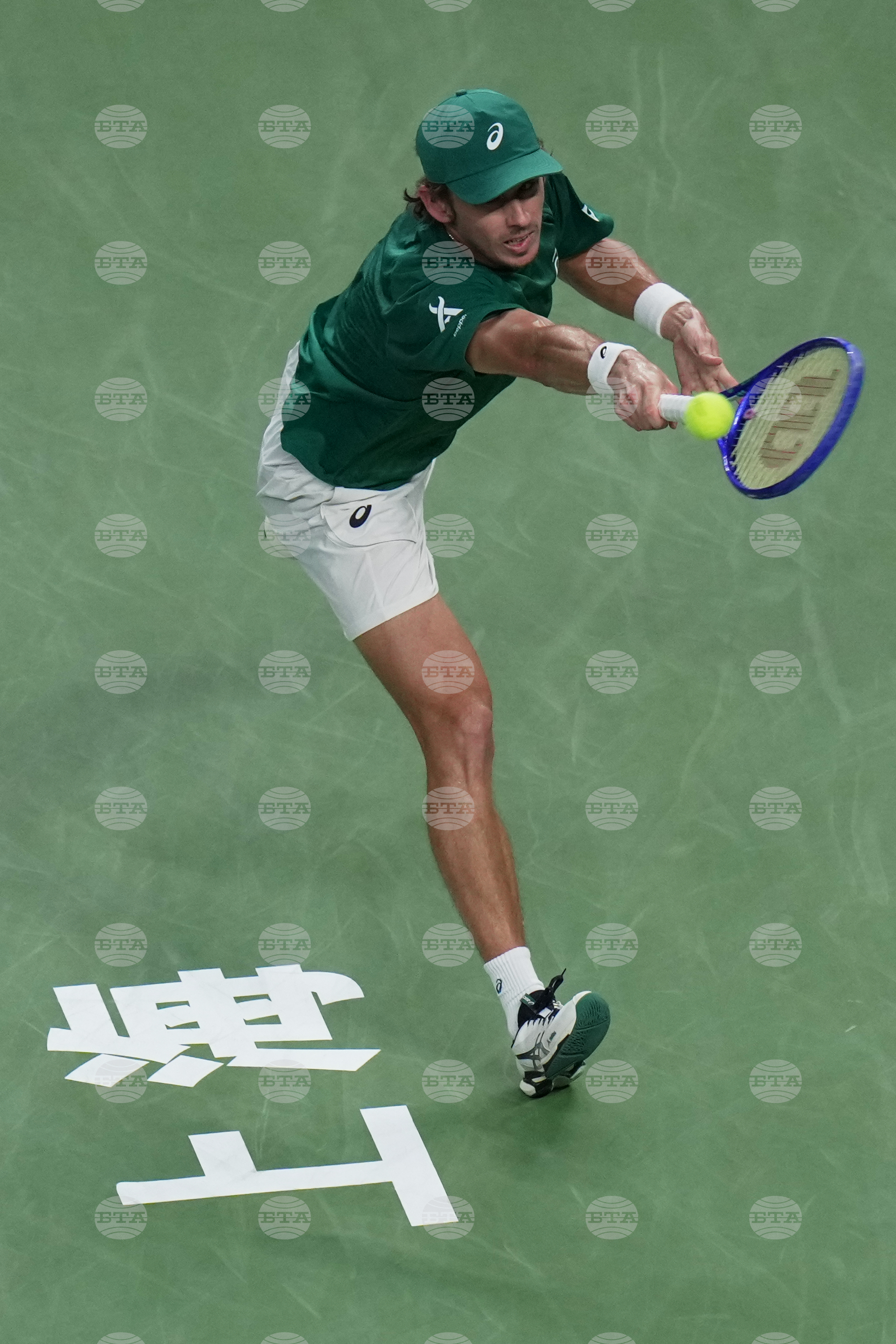 Alex De Minaur of Australia, left, plays against Daniil Medvedev of Russia during their men's singles quarterfinal match of the Shanghai Masters tennis tournament at Qizhong Forest Sports City Tennis Center, in Shanghai, China, Friday, Oct. 10, 2025. (AP Photo/Andy Wong)