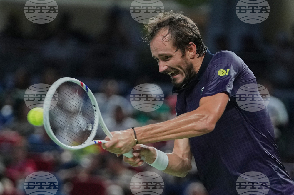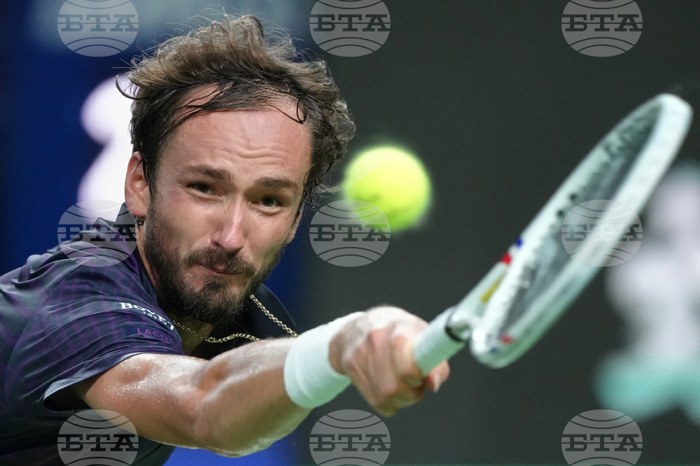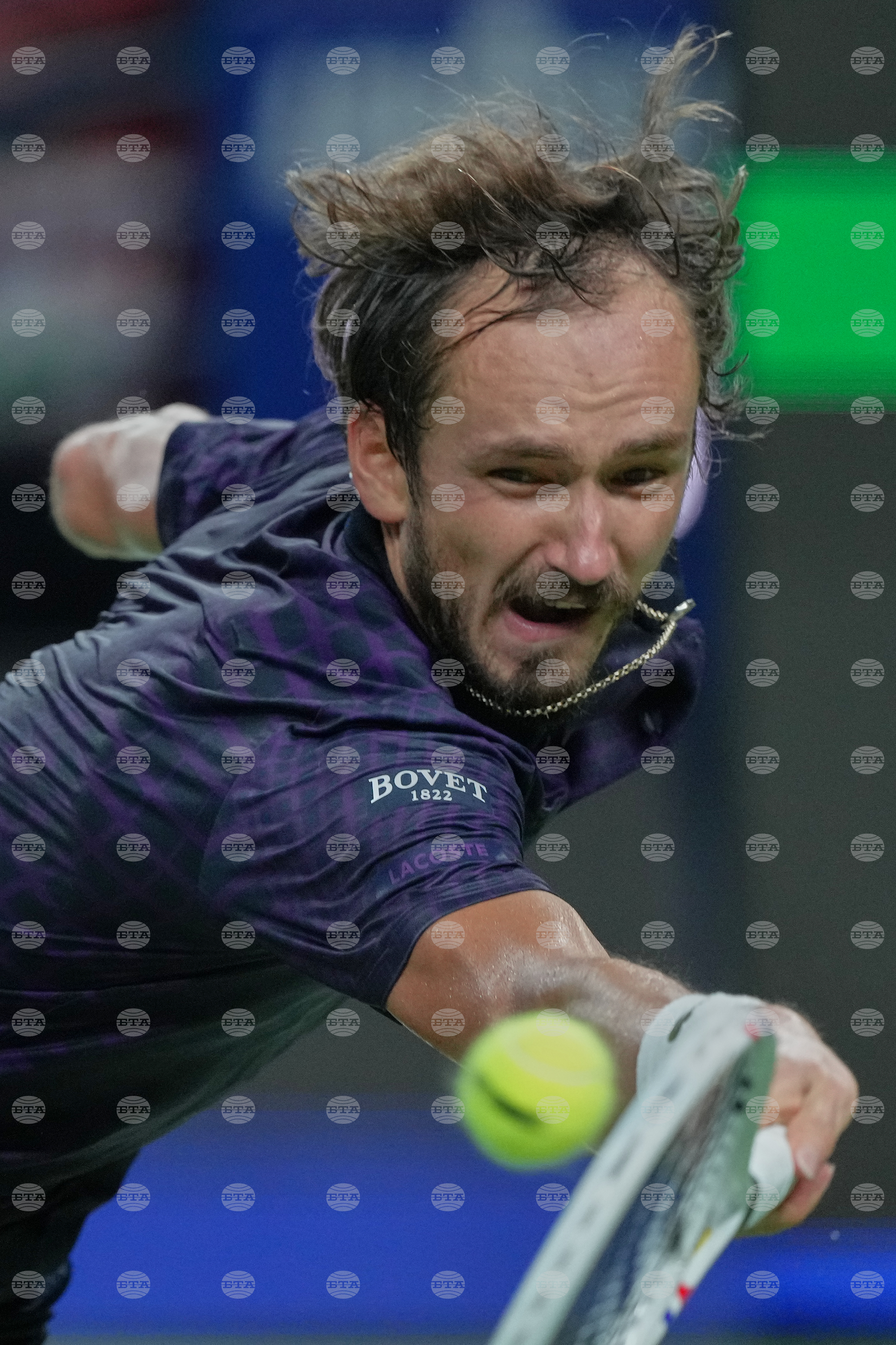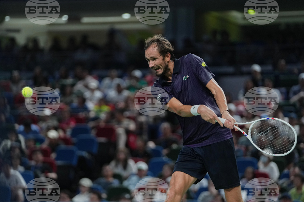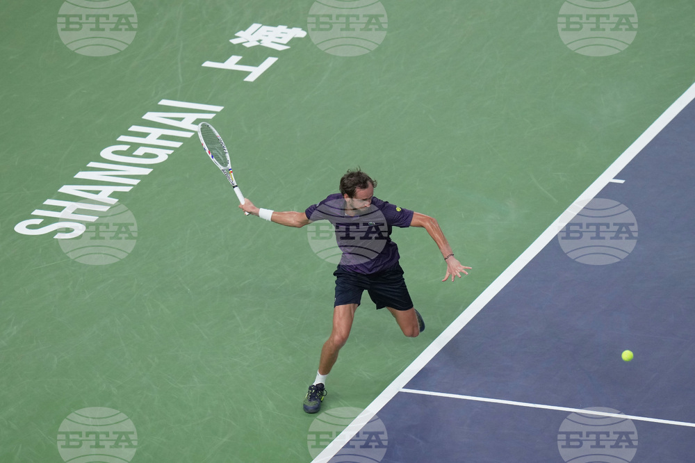 Daniil Medvedev of Russia returns a backhand shot from Alex De Minaur of Australia during their men's singles quarterfinal match of the Shanghai Masters tennis tournament at Qizhong Forest Sports City Tennis Center, in Shanghai, China, Friday, Oct. 10, 2025. (AP Photo/Andy Wong)