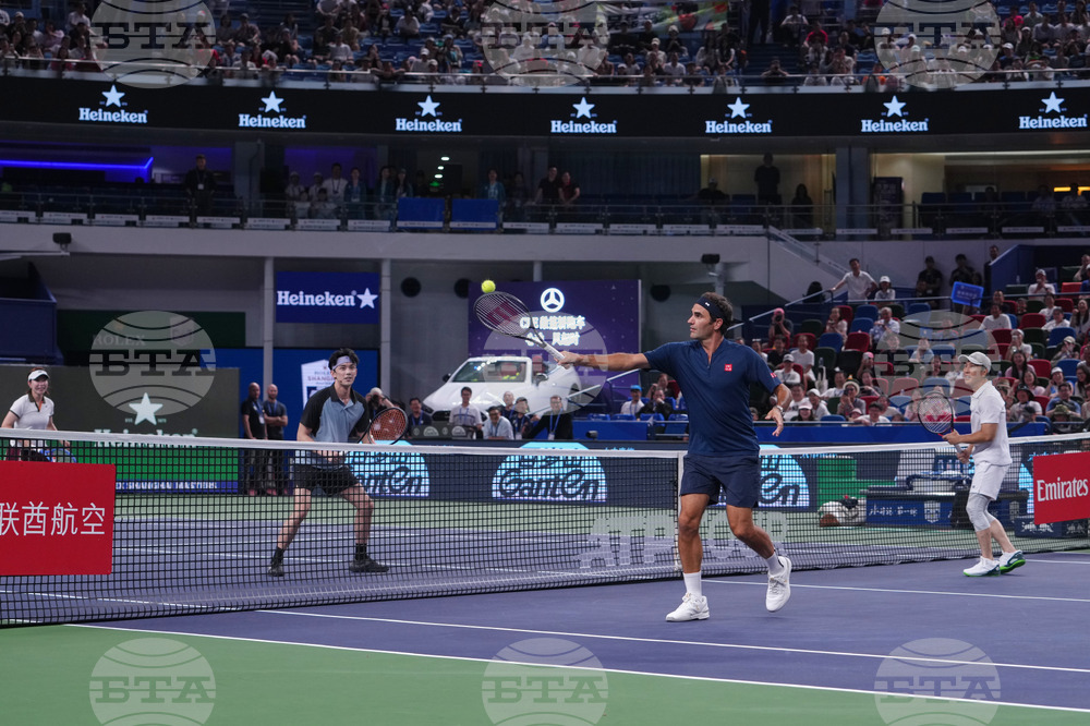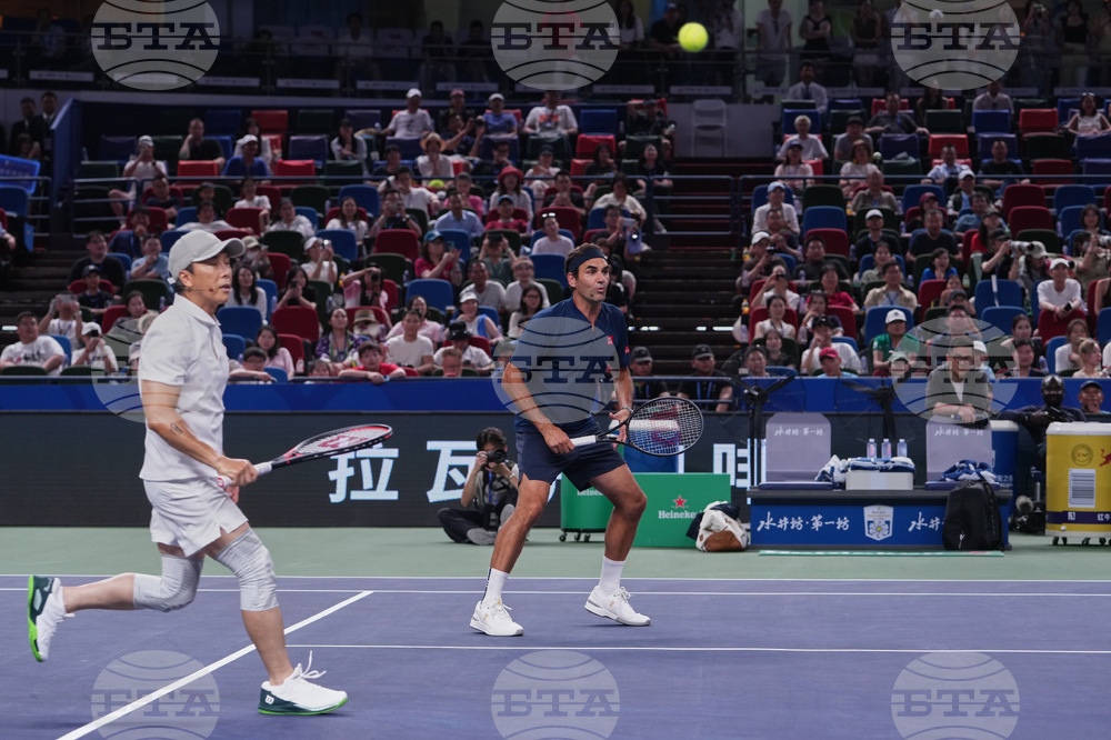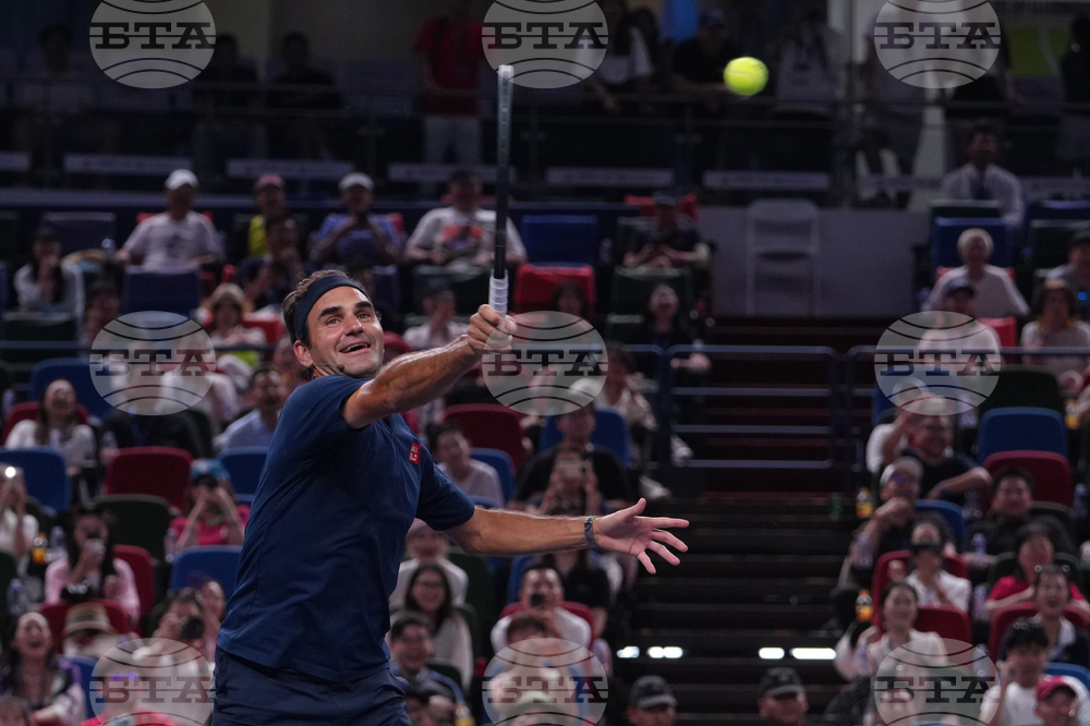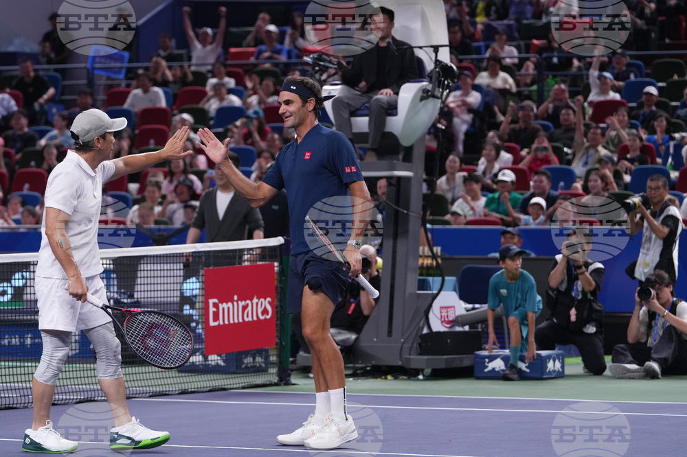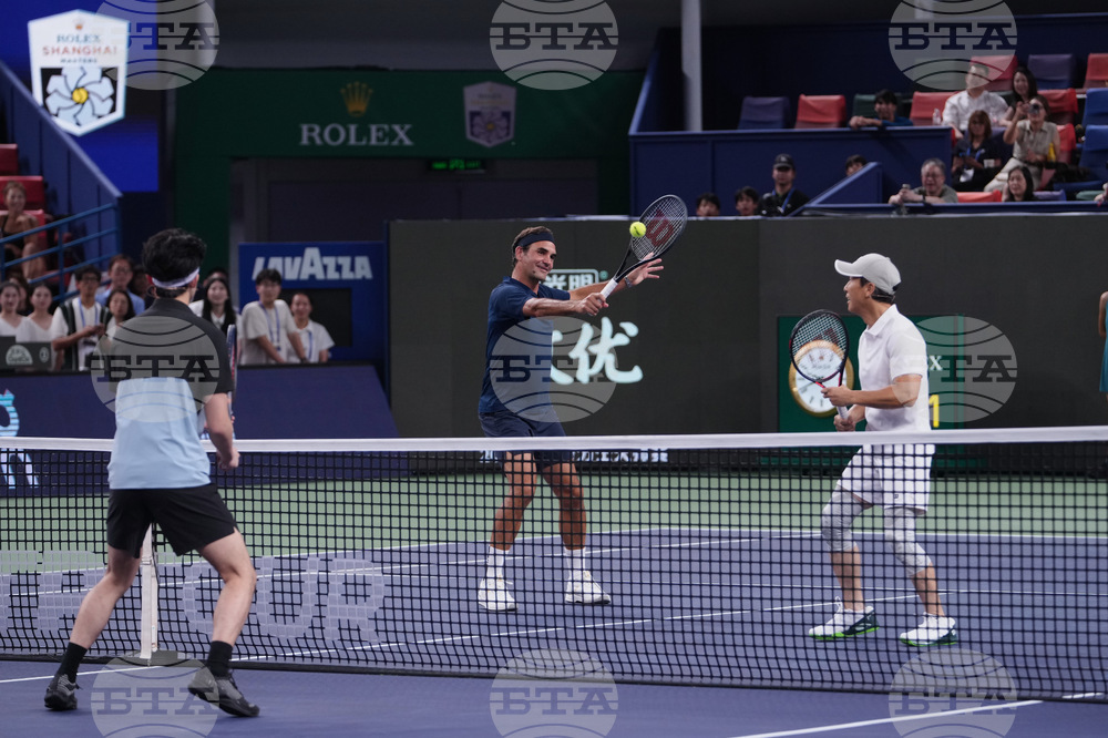 Roger Federer, Swiss former tennis player plays at the Roger and Friends Celebrity Doubles with Chinese tennis legend Zheng Jie, Chinese actor Wu Lei, and Hong Kong's actor Donnie Yen during the Shanghai Masters tennis tournament at Qizhong Forest Sports City Tennis Center, in Shanghai, China, Friday, Oct. 10, 2025. (AP Photo/Andy Wong)