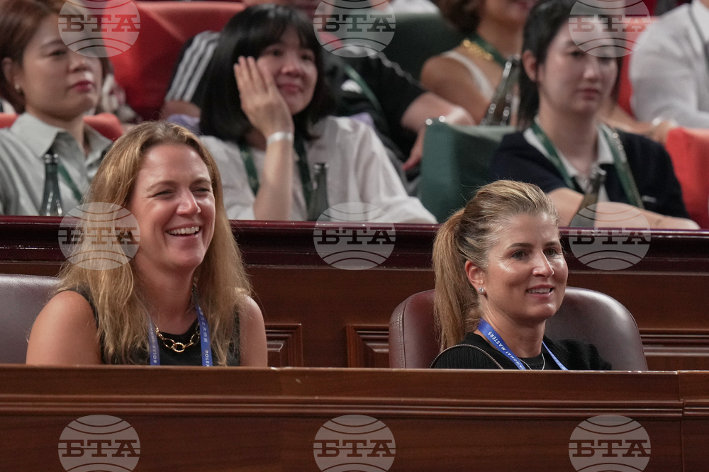 Mirka Federer, wife of Roger Federer, right, watches the Roger and Friends Celebrity Doubles with Chinese tennis legend Zheng Jie, Chinese actor Wu Lei, and Hong Kong's actor Donnie Yen during the Shanghai Masters tennis tournament at Qizhong Forest Sports City Tennis Center, in Shanghai, China, Friday, Oct. 10, 2025. (AP Photo/Andy Wong)