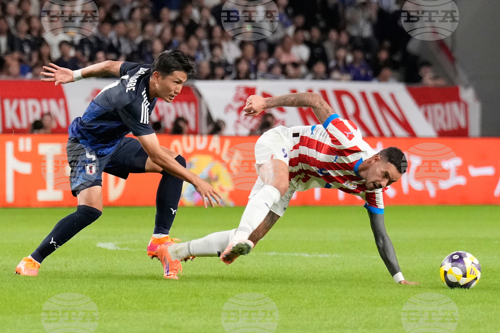 Paraguay's Miguel Almiron, right, and Japan's Tsuyoshi Watanabe fight for the ball during the friendly soccer match between Japan and Paraguay on Friday, Oct. 10, 2025, in Suita, Osaka, western Japan. (AP Photo/Eugene Hoshiko)