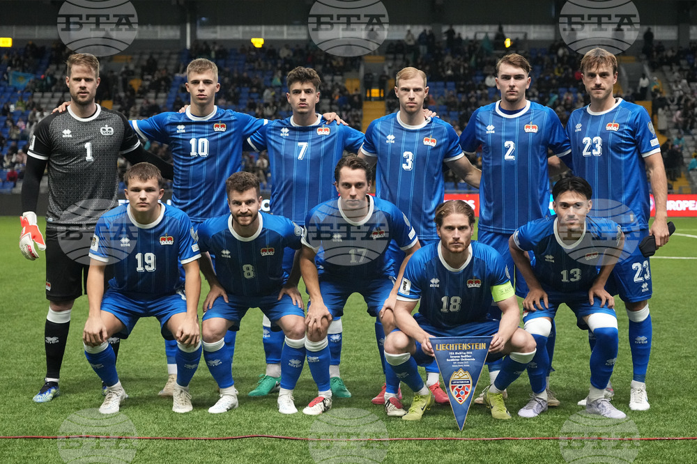 Liechtenstein's players pose prior to a World Cup 2026 group J qualifying soccer match between Kazakhstan and Liechtenstein at the Astana Arena in Astana, Kazakhstan, Friday, Oct. 10, 2025. (AP Photo/Turar Kazangapov)