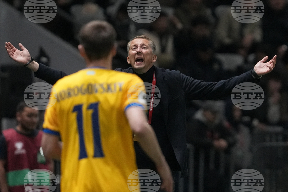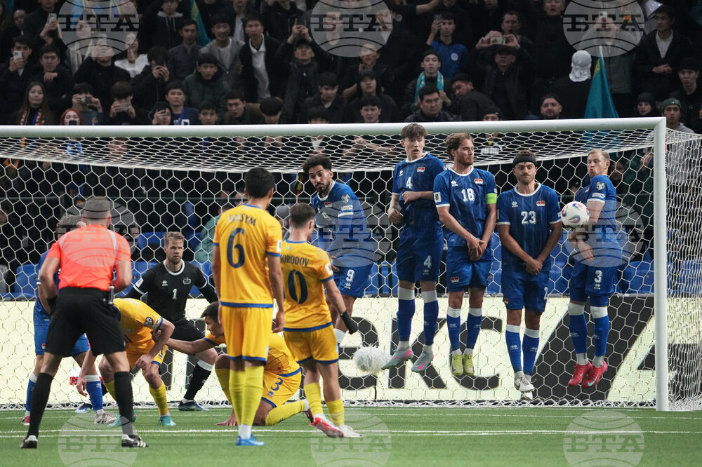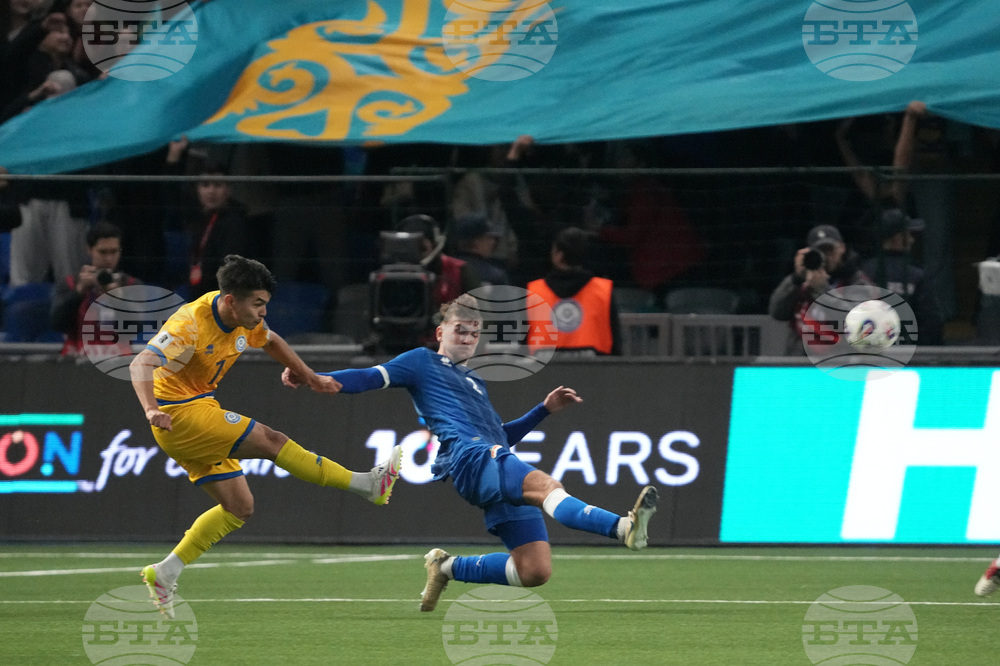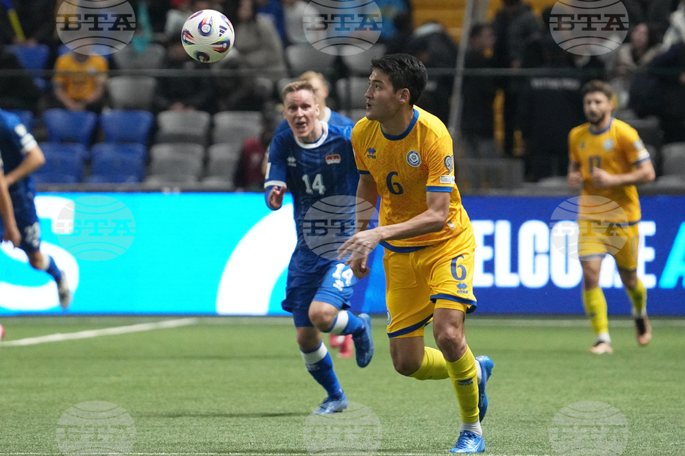 Kazakhstan's players listen to the national anthem during a World Cup 2026 group J qualifying soccer match between Kazakhstan and Liechtenstein at the Astana Arena in Astana, Kazakhstan, Friday, Oct. 10, 2025. (AP Photo/Turar Kazangapov)