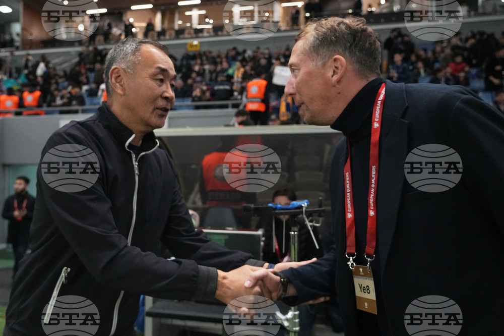 Liechtenstein's head coach Konrad Funfstuck, right, and Kazakhstan's head coach Talgat Baisufinov shake hands prior to a World Cup 2026 group J qualifying soccer match between Kazakhstan and Liechtenstein at the Astana Arena in Astana, Kazakhstan, Friday, Oct. 10, 2025. (AP Photo/Turar Kazangapov)