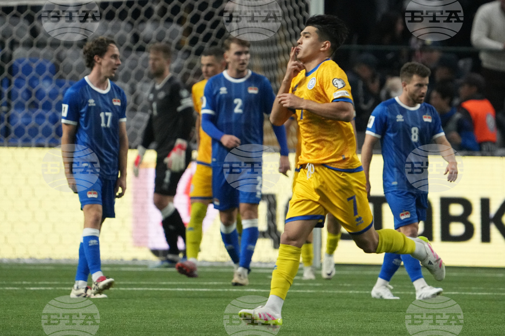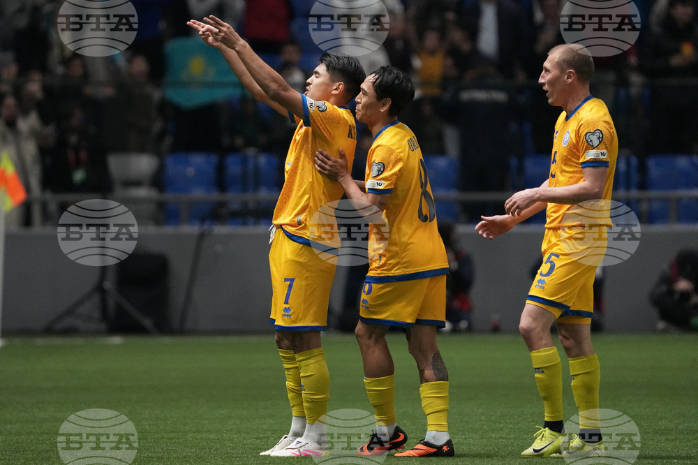 Kazakhstan's players celebrate after scoring a goal during a World Cup 2026 group J qualifying soccer match between Kazakhstan and Liechtenstein at the Astana Arena in Astana, Kazakhstan, Friday, Oct. 10, 2025. (AP Photo/Turar Kazangapov)