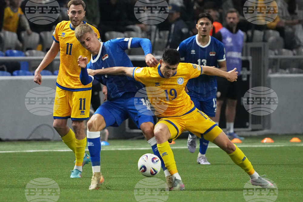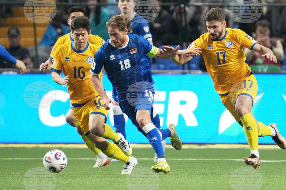 Liechtenstein's players, right, jump to block the ball during a World Cup 2026 group J qualifying soccer match between Kazakhstan and Liechtenstein at the Astana Arena in Astana, Kazakhstan, Friday, Oct. 10, 2025. (AP Photo/Turar Kazangapov)