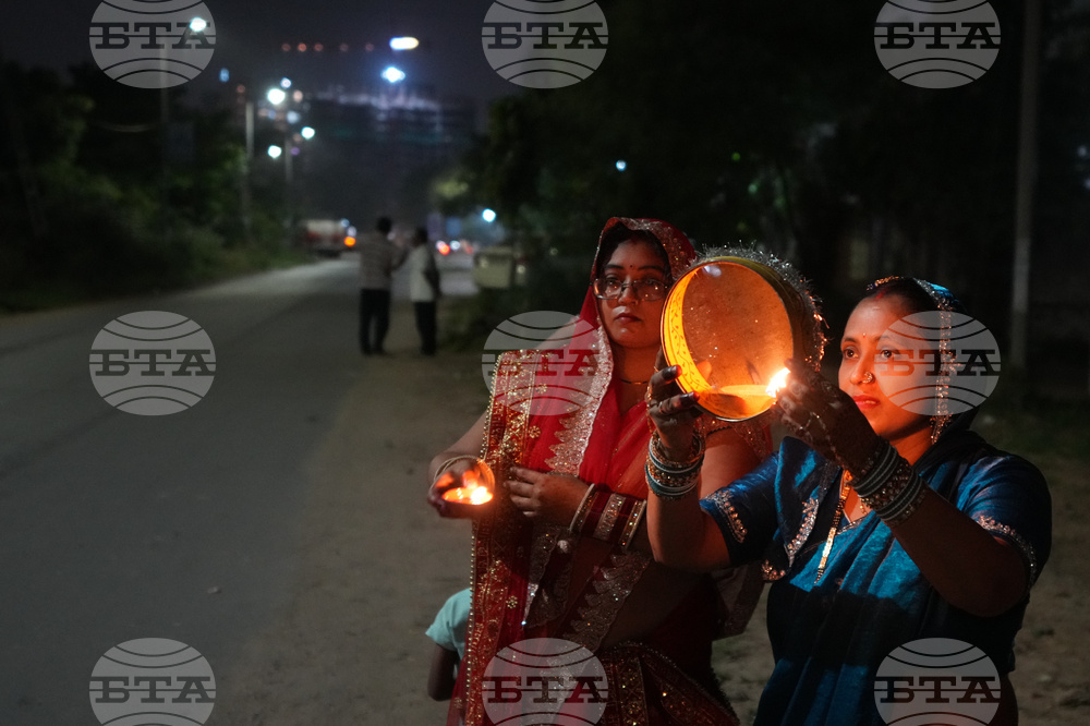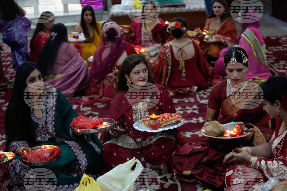 Married Hindu women perform rituals during Karva Chauth festival, in Jammu, India, Friday, Oct.10, 2025.(AP Photo/Channi Anand)