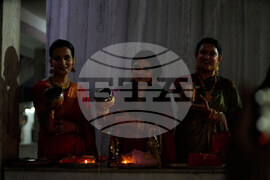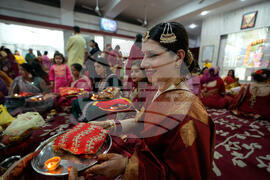 An Indian Hindu married woman offer prayers during Karva Chauth festival in Jammu, Friday, Oct.10, 2025.(AP Photo/Channi Anand)