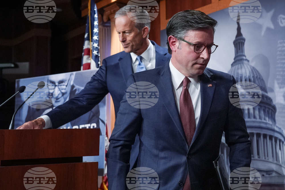 Senate Majority Leader John Thune, R-S.D., left, and Speaker of the House Mike Johnson, R-La., depart a news conference as the government shutdown begins its tenth day, in Washington, Friday, Oct. 10, 2025. (AP Photo/J. Scott Applewhite)