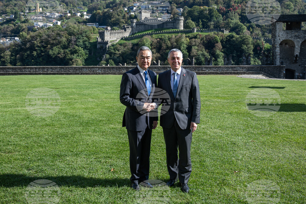 Swiss Federal Councillor and Foreign Minister Ignazio Cassis, left, meets with Chinese Foreign Minister Wang Yi during an official visit at Castelgrande in Bellinzona, Switzerland, Friday Oct. 10, 2025. (Elia Bianchi/Keystone via AP)