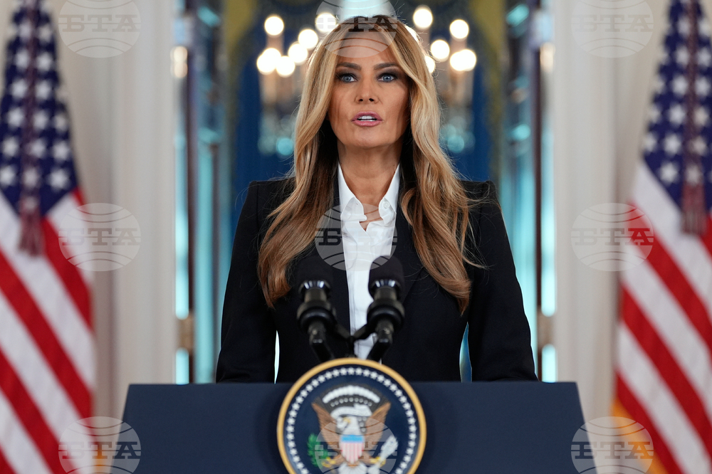 First lady Melania Trump speaks in the Grand Foyer of the White House, Friday, Oct. 10, 2025, in Washington. (AP Photo/Alex Brandon)
