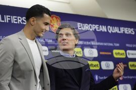 София (10 октомври 2025) Селекционерът на турския национален отбор по футбол Винченцо Монтела (вдясно) и вратаря на отбора Угурджан Чакър (вляво) дадоха пресконференция, ден преди срещата между националните отбори по футбол на България и Турция от група Е на Световните квалификации.