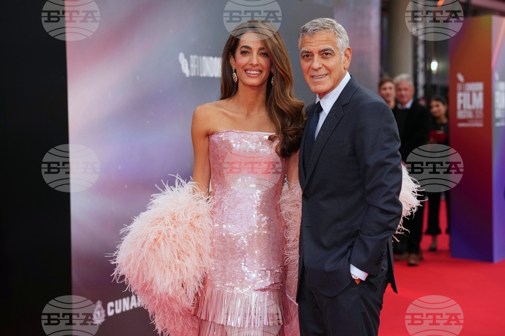 Amal Clooney, left, and George Clooney pose for photographers upon arrival at the premiere of the film "Jay Kelly" during the London film festival in London, Friday, Oct. 10, 2025. (Photo by Scott A Garfitt/Invision/AP)