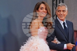 Amal Clooney, left, and George Clooney poses for photographers upon arrival at the premiere of the film "Jay Kelly" during the London film festival in London, Friday, Oct. 10, 2025. (Photo by Scott A Garfitt/Invision/AP)