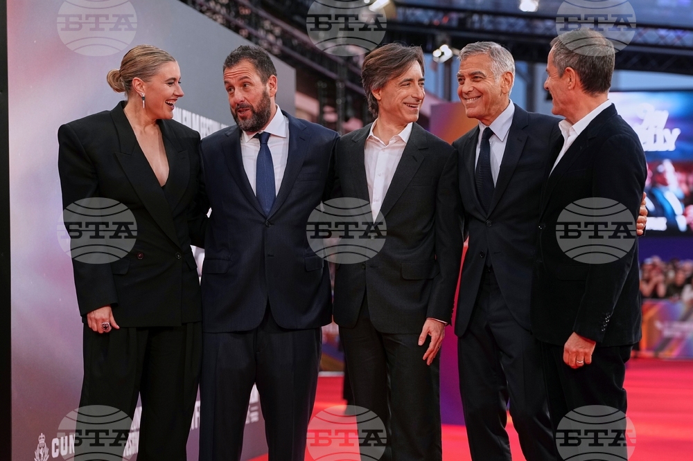 Greta Gerwig, from left, Adam Sandler, director Noah Baumbach, George Clooney and producer David Heyman pose for photographers upon arrival at the premiere of the film "Jay Kelly" during the London film festival in London, Friday, Oct. 10, 2025. (Photo by Scott A Garfitt/Invision/AP)