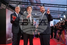 George Clooney, from left, director Noah Baumbach, and Adam Sandler pose for photographers upon arrival at the premiere of the film "Jay Kelly" during the London film festival in London, Friday, Oct. 10, 2025. (Photo by Scott A Garfitt/Invision/AP)