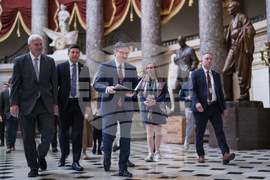 Speaker of the House Mike Johnson, R-La., center, is joined by House Majority Whip Tom Emmer, R-Minn., left, and Rep. Bryan Steil, R-Wis., chairman of the Committee on House Administration, second from left, as they walk through Statuary Hall to a news conference on the tenth day of the government shutdown, at the Capitol in Washington, Friday, Oct. 10, 2025. (AP Photo/J. Scott Applewhite)