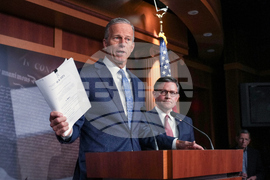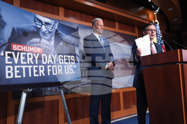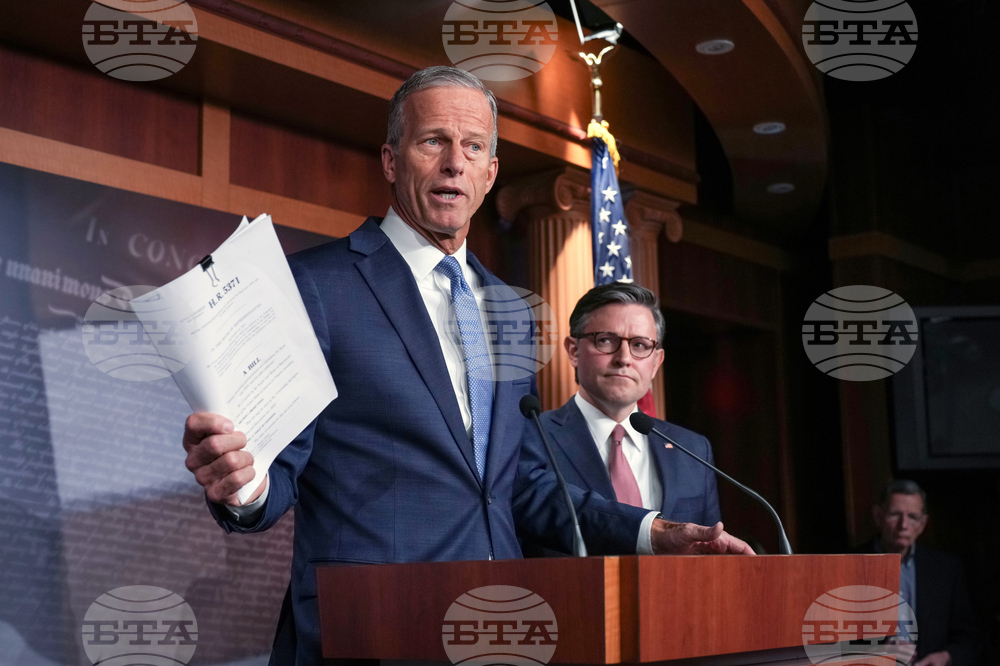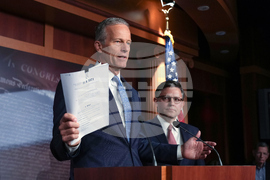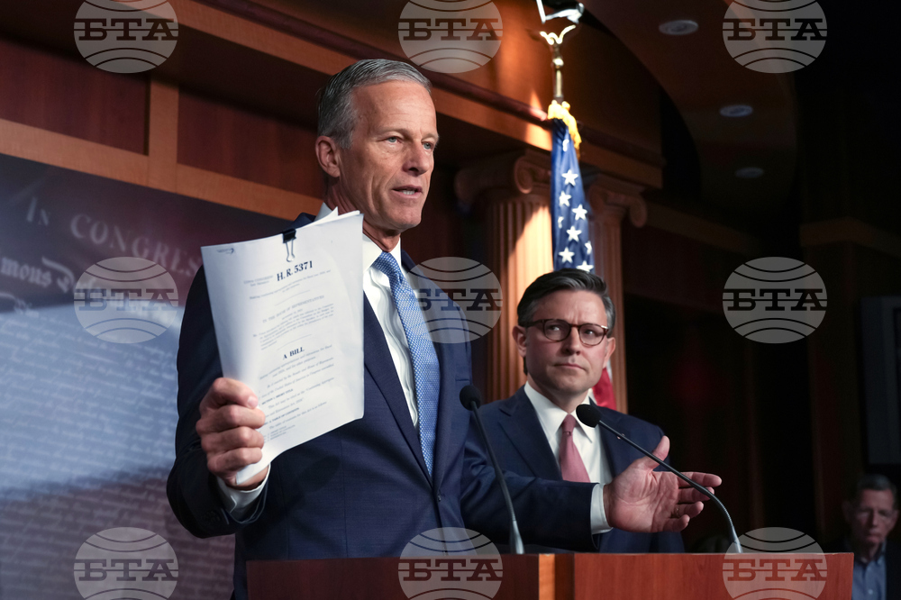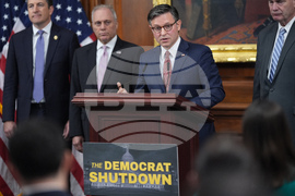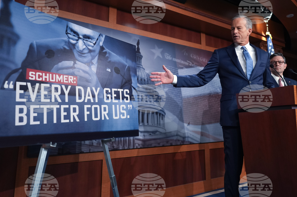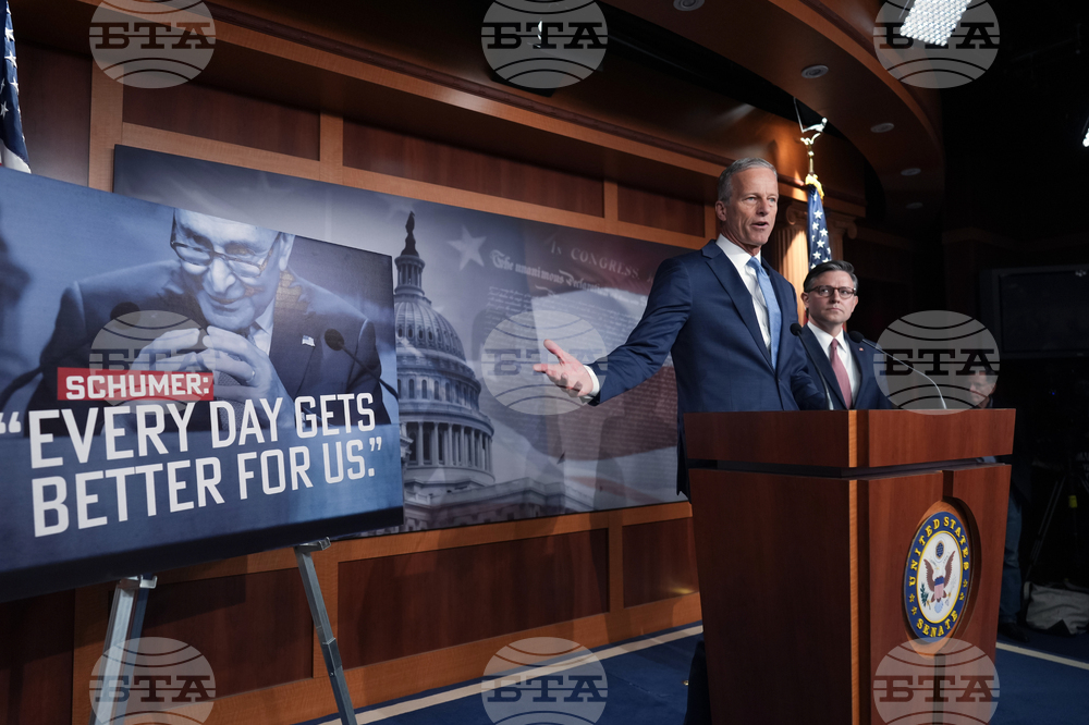 Senate Majority Leader John Thune, R-S.D., left, and Speaker of the House Mike Johnson, R-La., meet with reporters as the government shutdown begins its tenth day, in Washington, Friday, Oct. 10, 2025. (AP Photo/J. Scott Applewhite)