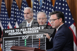 Speaker of the House Mike Johnson, R-La., listens to other GOP leaders as a government shutdown begins its tenth day, in Washington, Friday, Oct. 10, 2025. (AP Photo/J. Scott Applewhite)