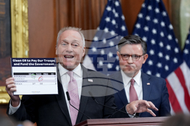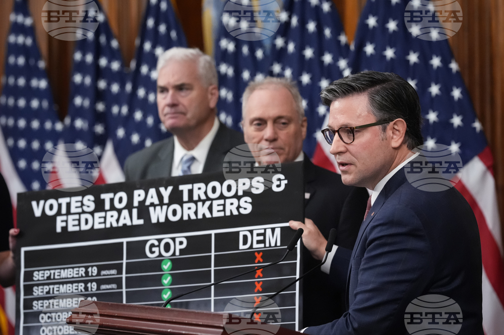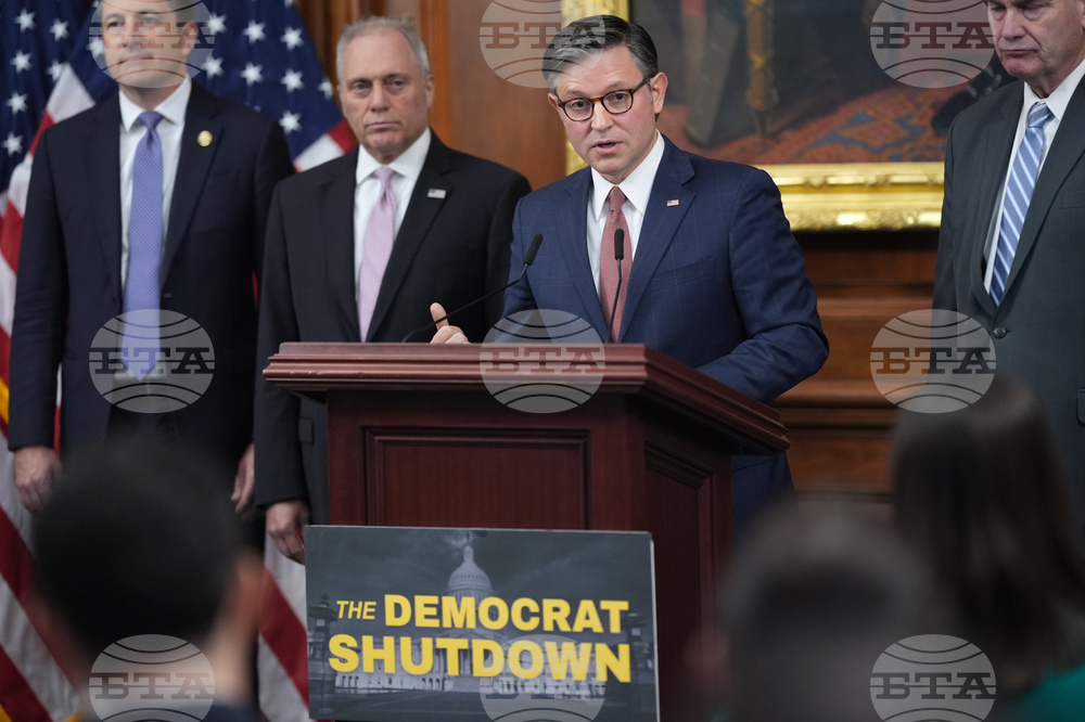 Speaker of the House Mike Johnson, R-La., center, is joined by, from left, Rep. Bryan Steil, R-Wis., chairman of the Committee on House Administration, House Majority Leader Steve Scalise, R-La., and House Majority Whip Tom Emmer, R-Minn., during a news conference as a government shutdown begins its tenth day, in Washington, Friday, Oct. 10, 2025. (AP Photo/J. Scott Applewhite)