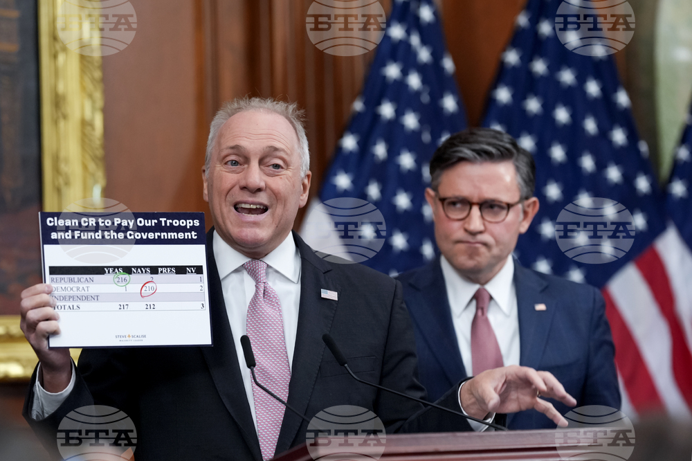 House Majority Leader Steve Scalise, R-La., left, and Speaker of the House Mike Johnson, R-La., talk to reporters as a government shutdown begins its tenth day, in Washington, Friday, Oct. 10, 2025. (AP Photo/J. Scott Applewhite)