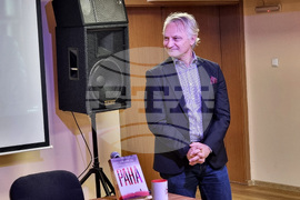 Плевен (10 октомври 2025) Писателят Захари Карабашлиев гостува в Плевен за среща с читатели в Регионална библиотека „Христо Смирненски“. Авторът представи най-новия си роман „Рана“ и разговаря с плевенчани на различни теми като колективната памет, за историята - как я учат децата и стига ли тя до тях, достатъчно ли се преподават българските автори в часовете по литература, какво е патриотизъм и как го разбираме днес. На снимката: след края на срещата авторът разговаря лично със своите читател.