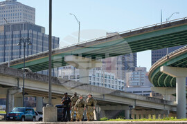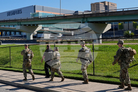 Members of the National Guard patrol along a street in Memphis, Tenn. Friday, Oct. 10, 2025. (AP Photo/George Walker IV)