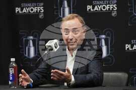 FILE - NHL Commissioner Gary Bettman speaks before Game 3 of an NHL hockey Stanley Cup second-round playoff series on May 9, 2025, in Sunrise, Fla. (AP Photo/Marta Lavandier, File)