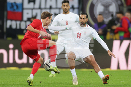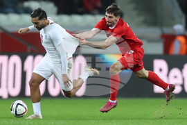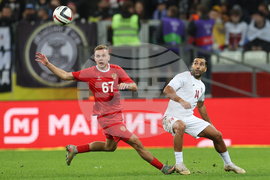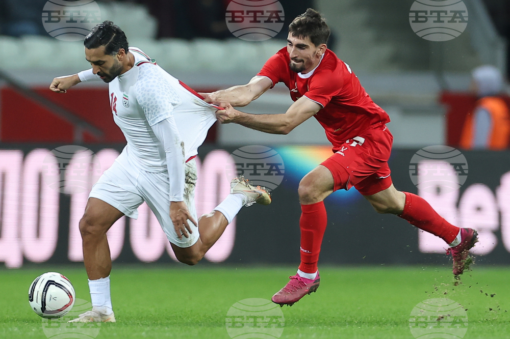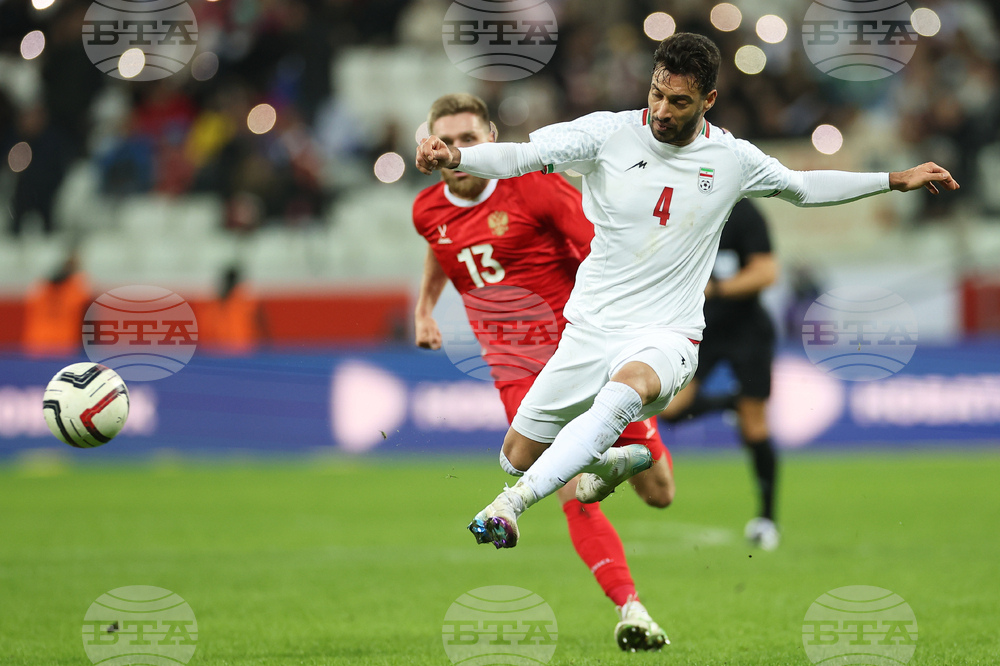 Iran's Ali Nemati, left, and Russia's Aleksei Batrakov fight for the ball during a friendly soccer match between Russia and Iran at Volgograd Arena in Volgograd, Russia, Friday, Oct. 10, 2025. (AP Photo)