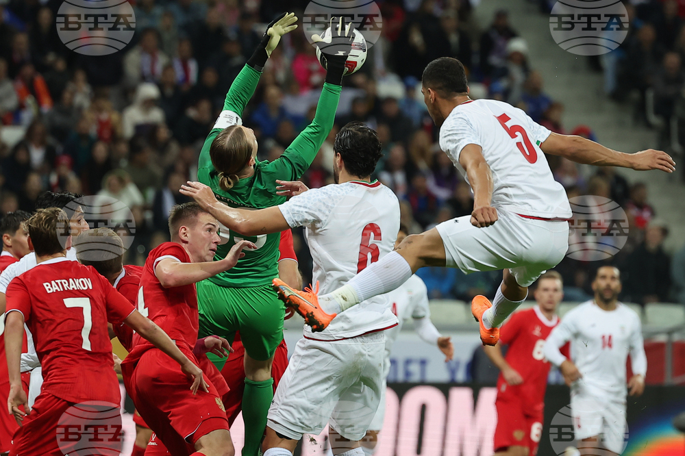 Russia's goalkeeper Matvey Safonov, center, cathes the ball during a friendly soccer match between Russia and Iran at Volgograd Arena in Volgograd, Russia, Friday, Oct. 10, 2025. (AP Photo)