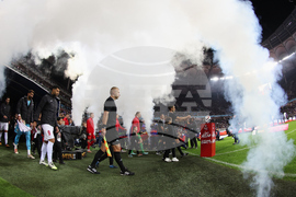 Russia and Iran players enter the pitch for a friendly soccer match between Russia and Iran at Volgograd Arena in Volgograd, Russia, Friday, Oct. 10, 2025. (AP Photo)