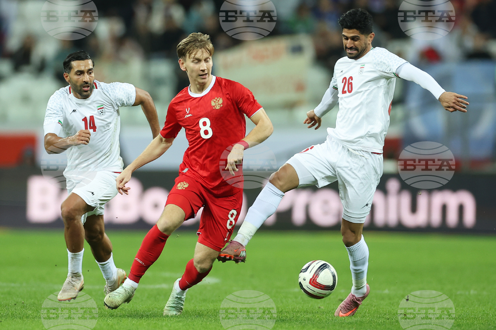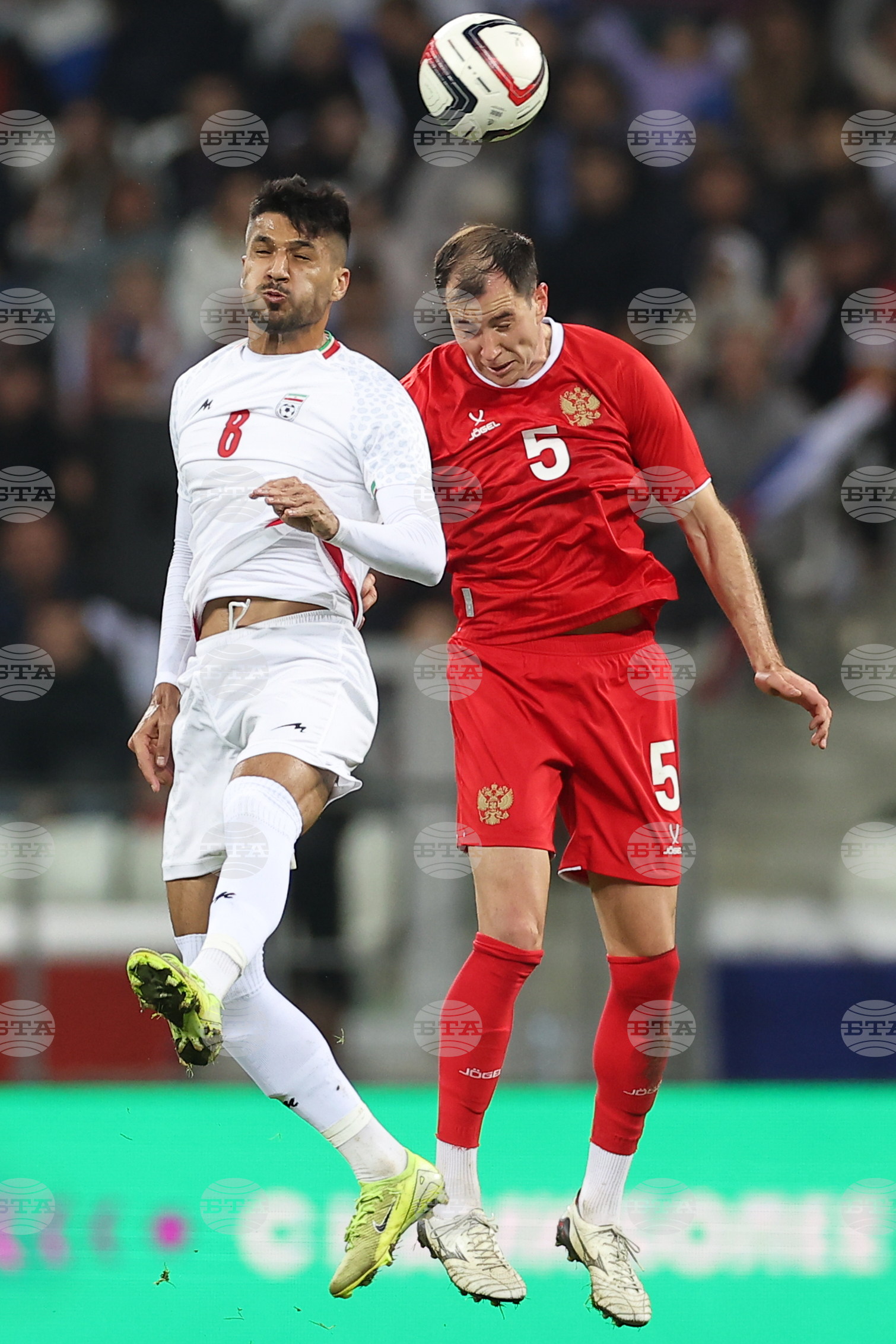 Russia's Ilya Vanakhia, left, and Iran's Amirhossein Hosseinzadeh fight for the ball during a friendly soccer match between Russia and Iran at Volgograd Arena in Volgograd, Russia, Friday, Oct. 10, 2025. (AP Photo)