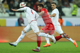 Russia's Maksim Glushenkov, left, and Iran's Saman Ghoddos fight for the ball during an international friendly soccer match between Russia and Iran at Volgograd Arena in Volgograd, Russia, Friday, Oct. 10, 2025. (AP Photo)
