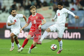 Iran's Saman Ghoddos, left, and Danial Esmaeilifar challenge Russia's Nail Umyarov for the ball during a friendly soccer match between Russia and Iran at Volgograd Arena in Volgograd, Russia, Friday, Oct. 10, 2025. (AP Photo)