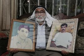 Yousef Shamasneh, 83, holds portraits of his two imprisoned sons, Abdel Jawad, right, and Mohammad, at his home in the West Bank village of Qatanna, west of Jerusalem, Friday, Oct. 10, 2025. (AP Photo/Mahmoud Illean)