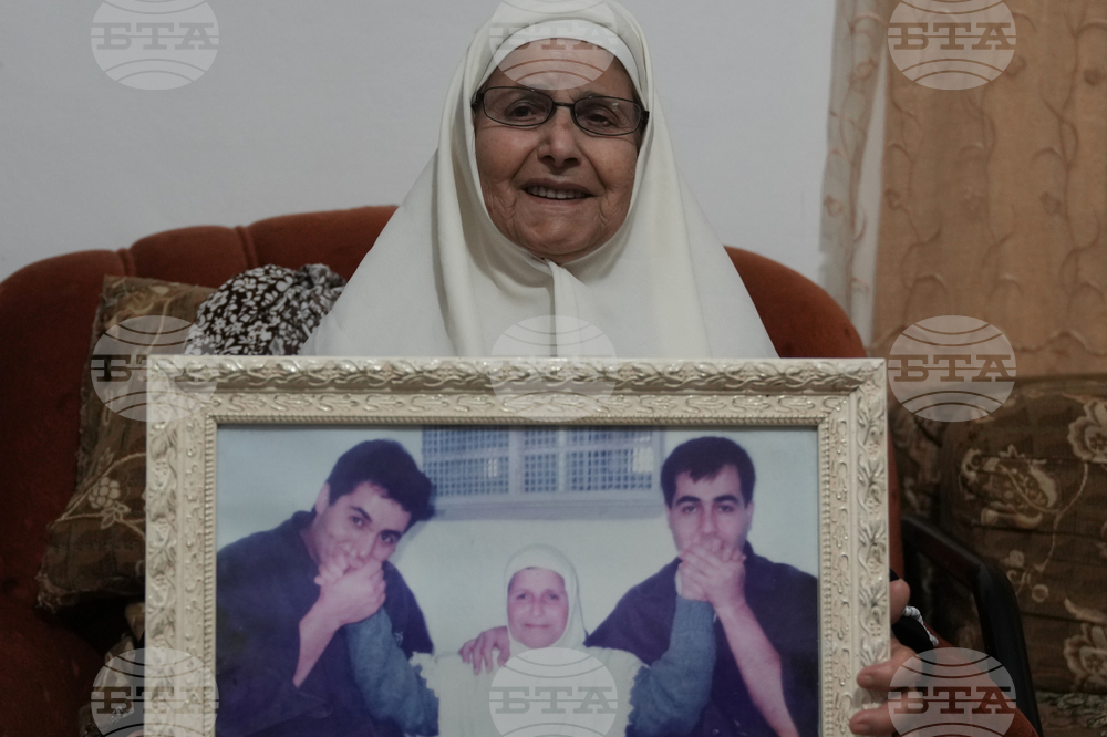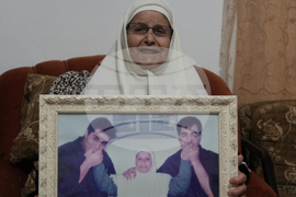 Halima Shamasneh, 83, holds a photo showing herself with her two imprisoned sons, Abdel Jawad and Mohammad, during a past prison visit, at her home in the West Bank village of Qatanna, west of Jerusalem, Friday, Oct. 10, 2025. (AP Photo/Mahmoud Illean)