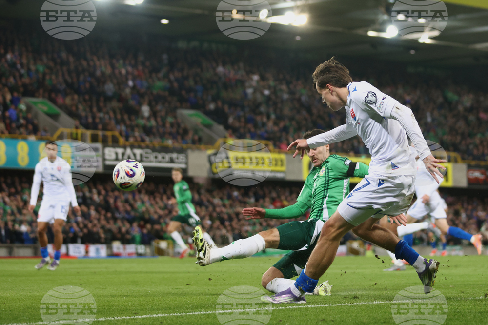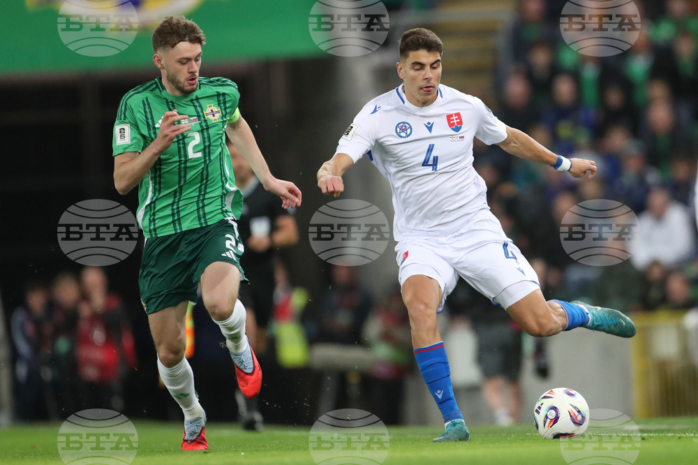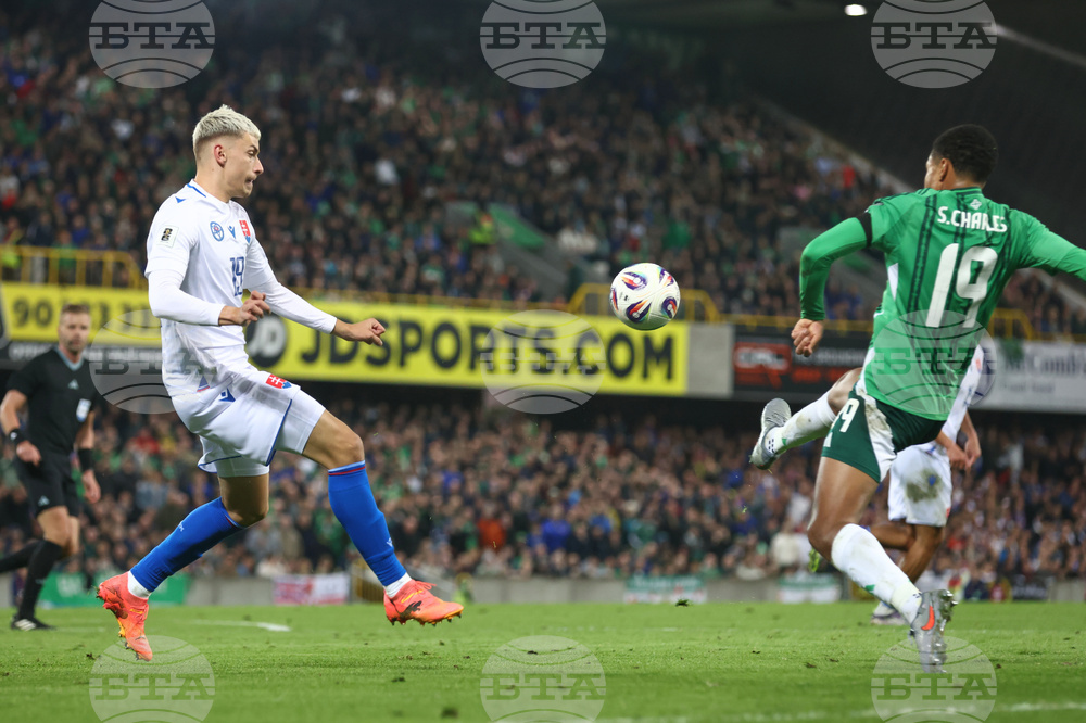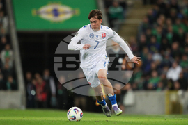 Slovakia's David Strelec in action during a World Cup 2026 group A qualifying soccer match between Northern Ireland and Slovakia at Windsor Park stadium, in Belfast, Northern Ireland, Friday, Oct. 10, 2025. (AP Photo/Peter Morrison)