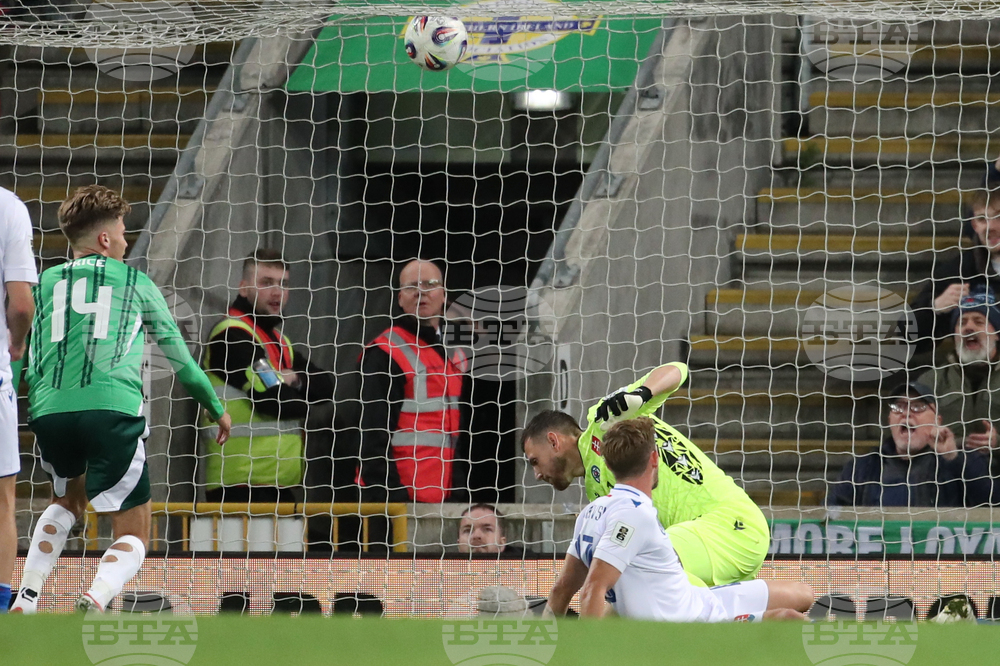 Slovakia's Patrik Hrosovsky, bottom, scores an own goal past his goalkeeper Martin Dubravka during a World Cup 2026 group A qualifying soccer match between Northern Ireland and Slovakia at Windsor Park stadium, in Belfast, Northern Ireland, Friday, Oct. 10, 2025. (AP Photo/Peter Morrison)