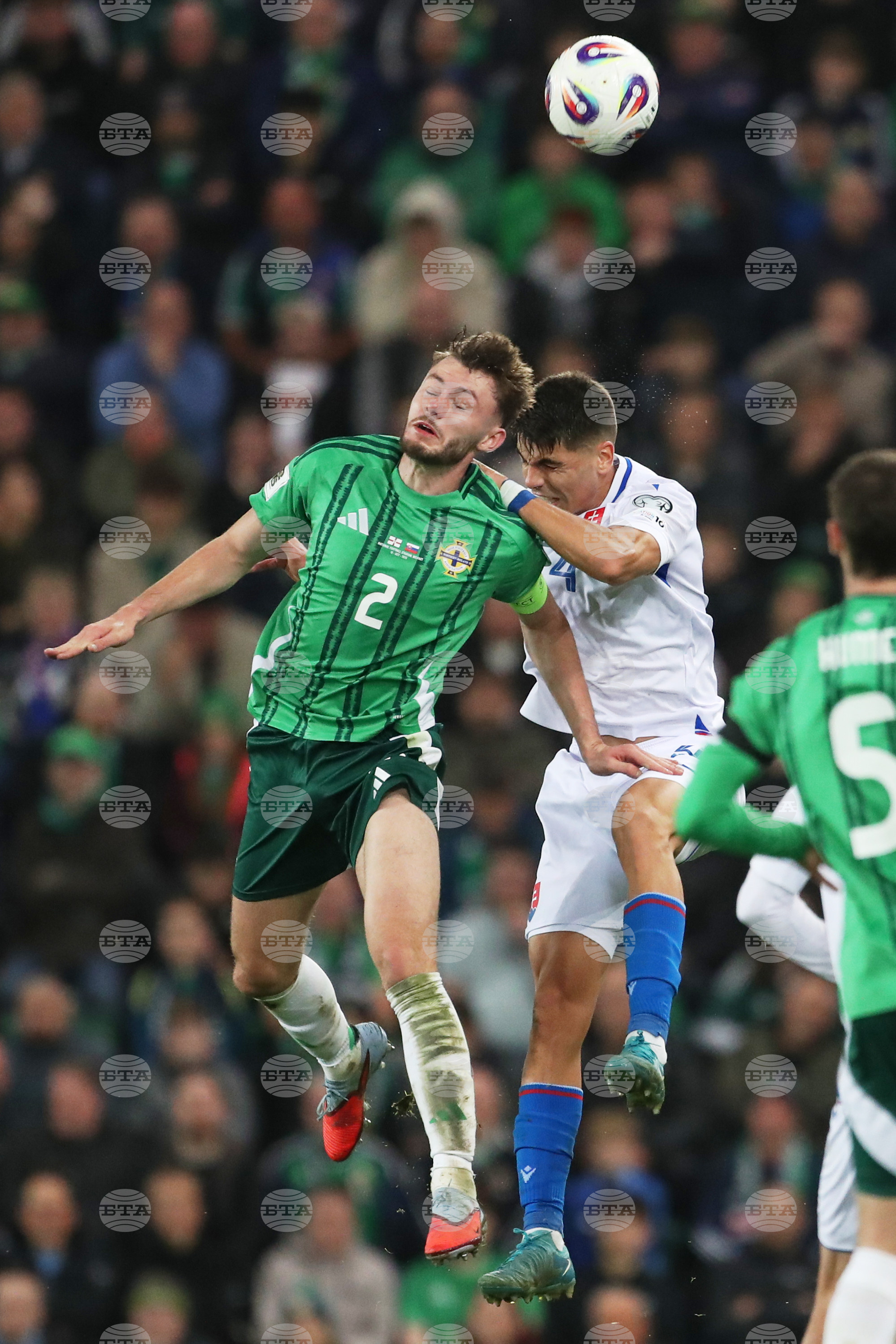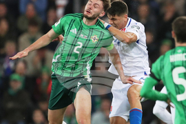 Ireland's Daniel Ballard, left, challenges for the ball with Slovakia's Adam Obert during a World Cup 2026 group A qualifying soccer match between Northern Ireland and Slovakia at Windsor Park stadium, in Belfast, Northern Ireland, Friday, Oct. 10, 2025. (AP Photo/Peter Morrison)