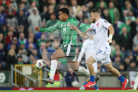 Ireland's Conor Bradley, left, challenges for the ball with Slovakia's Adam Obert during a World Cup 2026 group A qualifying soccer match between Northern Ireland and Slovakia at Windsor Park stadium, in Belfast, Northern Ireland, Friday, Oct. 10, 2025. (AP Photo/Peter Morrison)